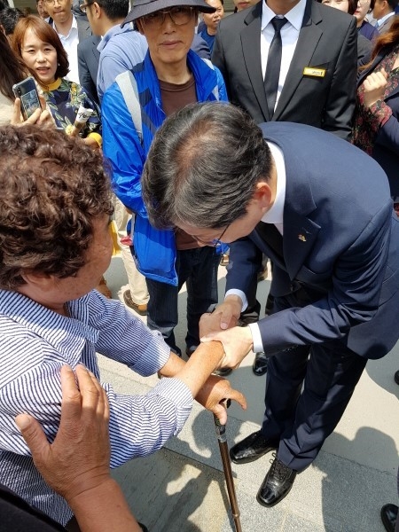 [포토뉴스]김해 봉하마을서 허리 굽혀 인사하는 김경수 경남도지사 당선인
