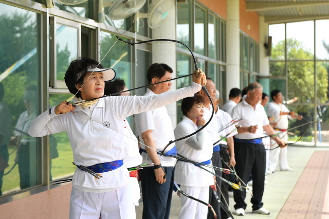 ▲22일 제450회 서부경남 5개 시군 10개정 친성궁도대회가 열린 남해 금해정에서 경남 명궁 250여명이 남해를 품고 활시위를 당겼다.ⓒ남해군