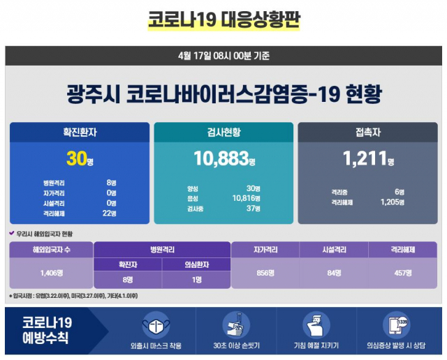 현재까지 광주 확진자 30명 중 신천지 관련자는 9명, 해외 유입 관련자는 20명으로, 지난달 16일 확진된 16번 환자부터는 모두 해외 유입 관련자다.