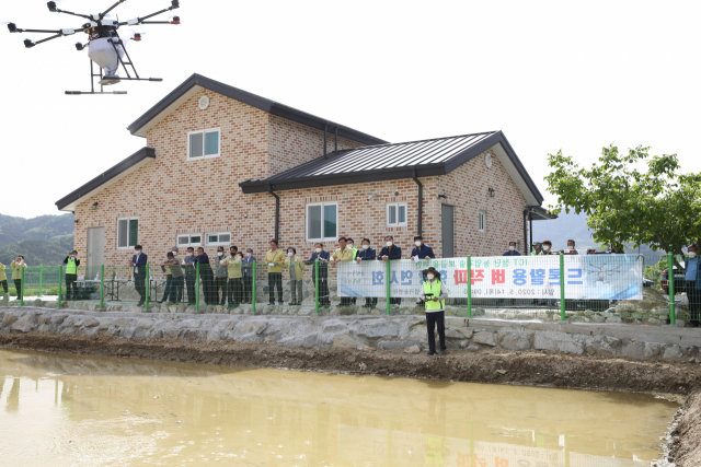 경북 성주군은 지난 14일 가천면 창천리 일대에서 사업참여 쌀 전업농 및 관계자 40여명이 참석한 가운데 드론을 활용한 벼 직파 연시회를 가졌다고 밝혔다.