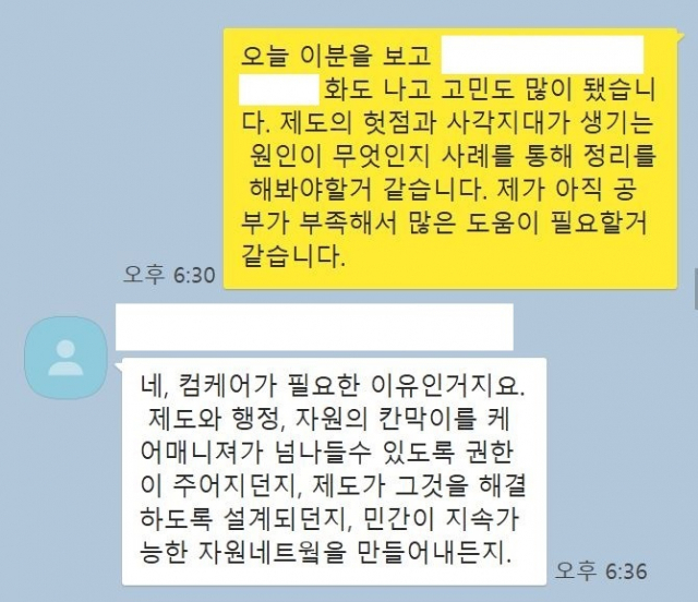 결국 이 분에게 가장 필요한 것은 집에서 지속적으로 도와줄 사람이었습니다. 혼자 거동하는 데 따르는 낙상 위험을 줄이고, 이분이 가장 힘들어하는 대소변 처리도 부끄러움을 무릅쓰지 않아도 당연히 도와줄 사람이 필요했습니다. 그러려면 돌봄서비스가 필요한데, 이분의 상황이 녹록치 않습니다. 이분이 장애인이라도 이전에 노인요양돌봄 서비스를 받았기에 더이상 장애인 활동 보조서비스를 받으실 수가 없다고 합니다. 거기다가 참으로 황당한 이야기지만 발가락 골절이라는 급성기 질환이 있어서 당장 노인요양돌봄 서비스를 받을 수가 없다는 것입니다. 노인요양돌봄 서비스를 받기 위해서는 의사 소견서가 필요한데, 적어도 6개월 정도 기능이 계속 떨어진 상태에 있어야 가능하기 때문이라고 합니다. 아니, 어차피 이분은 뇌병변 장애로 원래 거동이 불편한 분인데도요! 제도와 시스템의 사각이 이런 곳에서 드러납니다. 당사자의 필요가 아니라 서비스를 제공하는 사람들의 편의에 의해 만들어진 결과입니다.