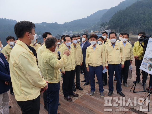 정세균 국무총리가 9일 오후 헬기편을 이용해 제9호 태풍 ‘마이삭’과 10호 태풍 ‘하이선’으로 막대한 피해를 입은 울릉도를 긴급 방문해 피해 현장을 둘러보고 주민들을 위로했다.