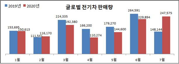 올해 3~5월 판매량은 전년 대비 폭락한 수준임이 확연히 눈에 띈다. 전기차의 경우 4~5월에 전년과 비슷한 판매량을 기록했는데 말이다. 반대로 전기차 판매량이 전년 대비 2~3배가 상승하던 6~7월의 경우 승용차 판매량은 아직 지난해 수준을 회복하지 못했다. 즉, 승용차 판매량이 코로나19로 엄청난 타격을 입는 상황에서 전기차 판매량은 2배 이상 늘어난 것이다.