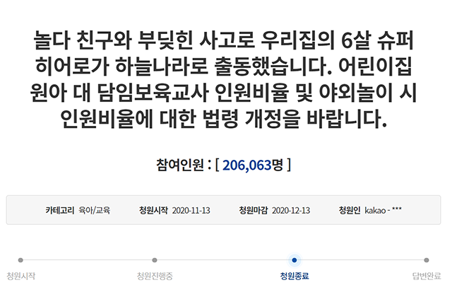 앞서 지난달 13일 청와대 국민청원 게시판에는 '놀다 친구와 부딪힌 사고로 우리 집의 6살 슈퍼 히어로가 하늘나라고 출동했습니다. 어린이집 원아 대 담임보육교사 인원비율 및 야외놀이 시 인원비율에 대한 법령 개정을 바랍니다'라는 제목의 청원이 올라왔다. 전날 마감된 이 청원은 총 20만6063명의 동의를 얻어 청와대 답변 요건(30일간 20만 명 이상 동의)을 갖췄다.