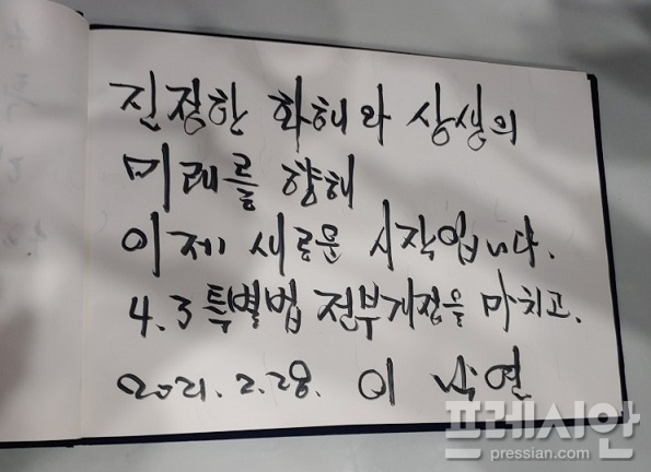 이 대표는 제주4‧3평화공원 위령제단에 참배한 후 위패봉안실를 찾아 방명록에 ‘진정한 화해와 상생의 미래를 향해 이제 새로운 시작입니다’라고 썼다.