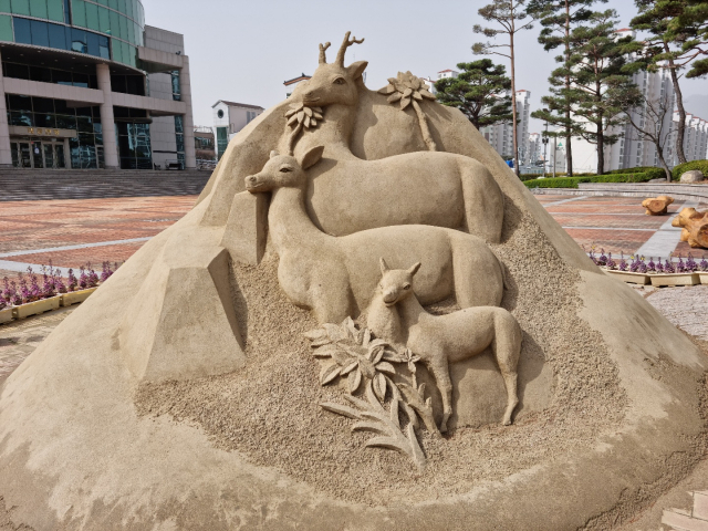수선화 향기 가득한 양산시의회 청사 옆 양산문화예술회관 광장에 모래조각 속에서 봄의 인사를 전하는 사슴들이 정겨운 시선을 끌어당긴다.