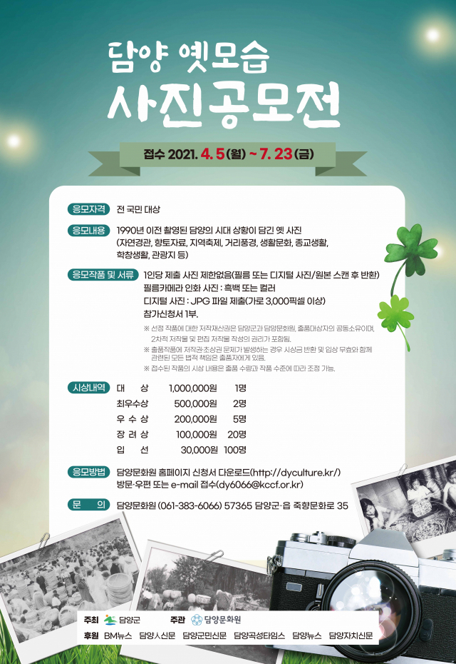 공모 내용은 1990년 이전 촬영된 필름, 사진 등 담양의 지난날을 기억할 수 있는 다양한 자료면 누구나 참여 가능하며 제출한 자료는 원본 스캔 후 참여자에게 돌려준다.