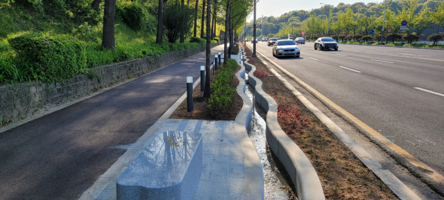 이번 사업으로 평범했던 보도를 꽃과 나무가 있는 녹지공간으로 바꾸고 보행자들에게 청량감을 느낄 수 있도록 비비추 등 초화류 12종 8,950본과 화살나무 등 14종 2,118본을 식재하고 항상 물이 흐르는 실개천 200m를 조성했다.