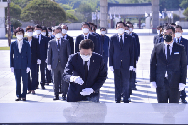 이 시장은 참배에 앞서 방명록에 ‘민주와 인권, 나눔과 연대의 오월정신을 더욱 계승, 발전시키겠습니다’라고 적었다.
