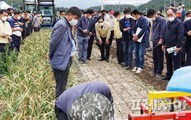 경남 창녕군은 27일 이방면 거남리 일원에서 ‘마늘 수확 기계 현장 연시회’를 가졌다.