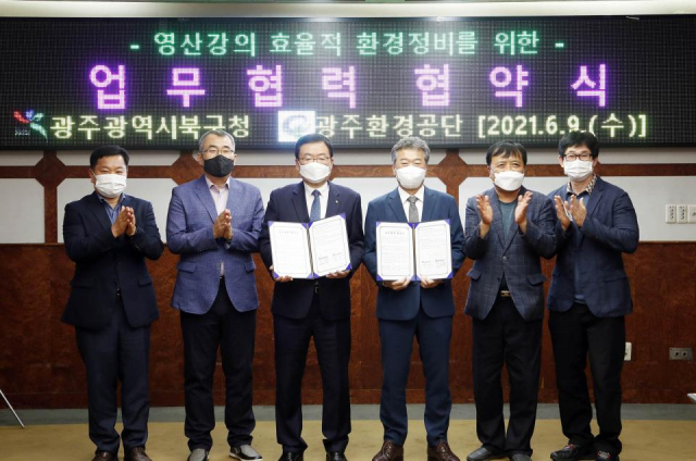 ▲광주시 북구가 국가하천인 영산강변을 보다 효율적으로 유지·관리하고자 9일 광주환경공단과 ‘영산강의 효율적 환경정비’를 위한 업무협약을 맺었다ⓒ광주시 북구