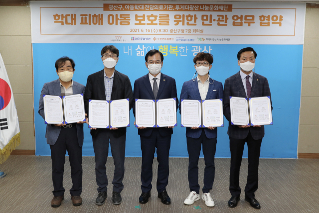 광산구는 16일 오전 구청 회의실에서 아동학대 전담의료기관 3곳, 투게더광산 나눔문화재단과 ‘아동학대 예방 및 피해아동 지원을 위한 업무 협약’을 체결했다.