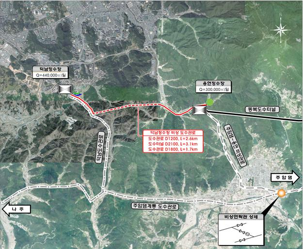 비상도수관로 사업은 광주시 수돗물 생산 공장인 용연정수장과 덕남정수장이 모든 수원지(동복댐, 주암댐)에서 원수를 확보할 수 있도록 추진된다. 이를 통해 주암댐 용수공급이 중단되더라도 덕남정수장 생산은 중단되지 않게 된다.