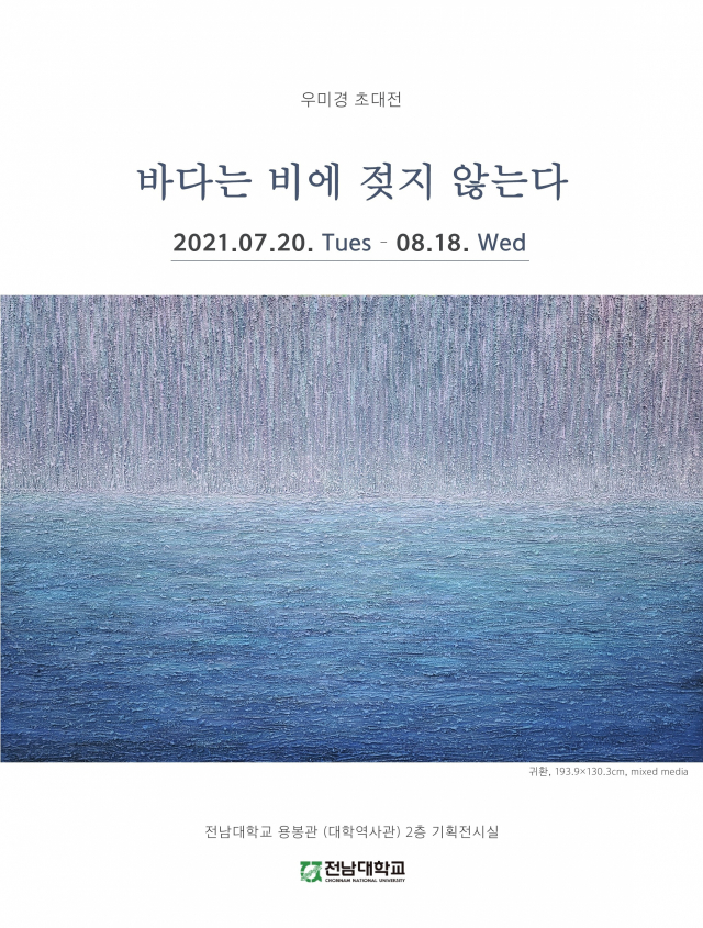 전남대학교박물관(관장 정금희)은 우미경 초대전 ‘바다는 비에 젖지 않는다’를 7월 20일부터 8월 18일까지 대학역사관 2층 기획전시실에서 개최한다.