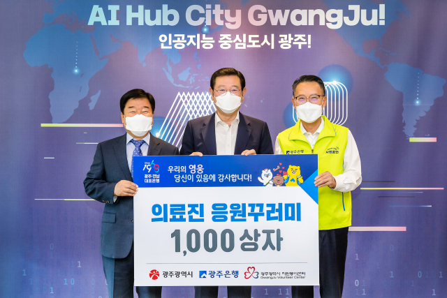 광주은행(은행장 송종욱)은 21일 광주광역시청에서 이용섭 광주광역시장과 송종욱 광주은행장, 김재규 광주광역시 자원봉사센터 이사장 등이 참석한 가운데 코로나19 의료진을 위한 5천만 원 상당의 ‘응원꾸러미’ 1,000상자를 전달했다고 밝혔다.