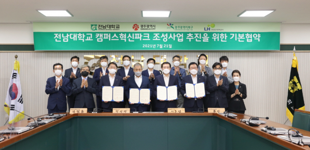 전남대는 7월 21일 대학본부에서 정성택 전남대 총장과 이용섭 광주광역시장, 문인 북구청장, 김현준 한국토지주택공사(LH) 사장이 참석한 가운데 ‘캠퍼스혁신파크 조성사업 추진을 위한 기본협약’을 체결하고 각 기관별 역할분담과 상호협력을 위한 사항을 구체화했다.