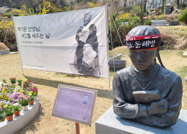 모란공원 민주묘역에 가면, 오래 전 이곳에 묻힌 전태일이 머리에 '노동해방'이라고 쓴 붉은 띠를 두르고 연배로는 대선배이지만 최근 묘역의 '새까만 후배'로 바로 옆에 입주한 백기완 선생님과 담소를 나누고 있다.