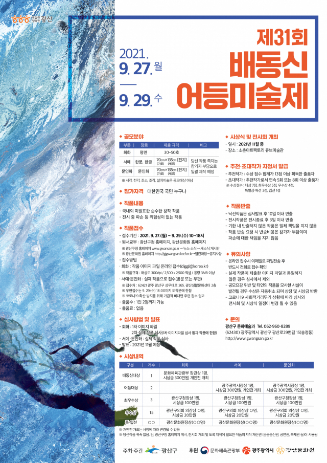 제31회 배동신 어등미술제에 대한 자세한 안내는 광산구 문화예술과에 문의하면 된다.
