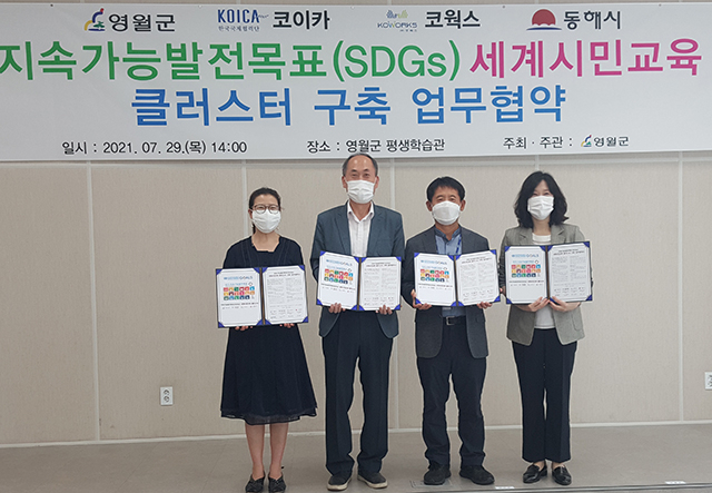 동해시(시장 심규언)는 29일 오후 2시 영월 월담작은도서관에서 동해시-코이카(한국국제협력단)–코웍스(한국국제협력단 파트너 자회사)–영월군4개 기관이 ‘동트는 동해대학’ 학사운영(교양과목)을 위한 지속가능발전목표(SDGs) 세계시민교육 클러스터 구축 업무협약을 체결했다.