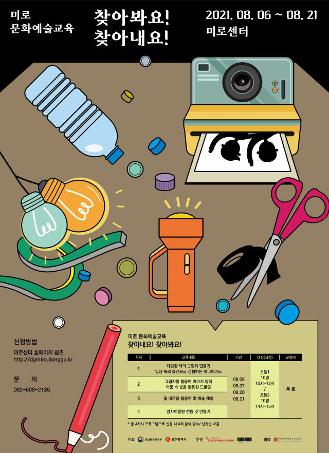 문화체육관광부·광주광역시가 주최하고 광주문화예술교육지원센터·광주광역시동구(미로센터) 주관, 한국문화예술교육진흥원 협력으로 진행되는 ‘찾아봐요! 찾아내요!’는 일상 속 소재를 활용한 창조적 예술 활동 경험을 중심으로 진행된다.