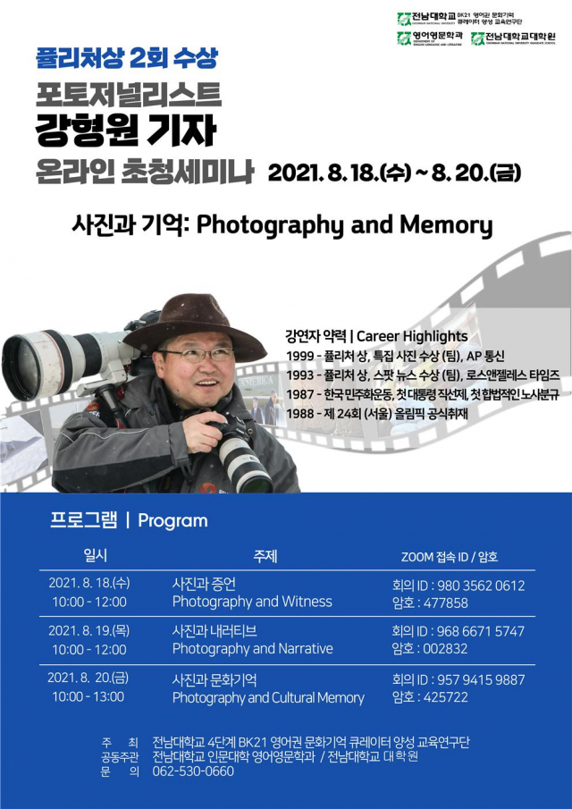 전남대학교 4단계 BK21 영어권 문화기억 큐레이터 양성 교육연구단(교육연구단장 김연민 교수. 이하 영문과 BK교육연구단)이 포토저널리스트 강형원 기자를 초청해 ‘사진과 기억(Photography and Memory)’이라는 주제로 온라인 블록세미나를 진행한다.