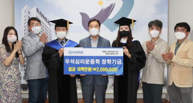 23일 대학 본관 2층 총장 집무실에서 열린 ‘우석심리운동학 장학기금’ 전달식에는 남천현 총장과 유윤조 대학원장, 김윤태(심리운동학과) 주임교수, 2020학년도 후기에 박사학위를 받을 예정인 옥필훈 전주비전대 교수와 여은혜 평택대 교수 등이 참석했다.