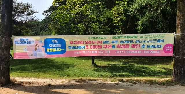 전남대, 총동창회, 민주동우회는 오는 10월 25일 오전 8시부터 9시까지 1시간 동안 전남대 용봉캠퍼스 정문과 후문, 공대쪽문, 예대 쪽문 등 모두 4곳에서 등교하는 대학(원)생들에게 5천 원권 무료이용권 2천매를 선착순 배부하는 ‘후배들아 힘내라’ 행사를 가진다.