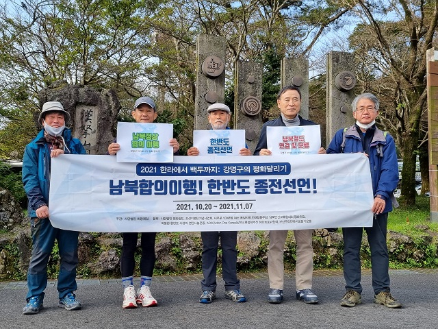 어제 한라산 백록담에서 평화발원제를 시작으로 오늘은 성판악에서 시작하여 제주도청으로 출발하는 발길은 가볍다. 어제에 이어 조헌정 목사님, 황광석, 김필수, 오미령, 이황휘 씨와 서울에서부터 내려온 이한용 대표가 함께했다. 어제 한라산 등반으로 약간의 근육통으로 다들 고생을 했지만 마음만은 오랜만에 찾은 맑고 푸른 가을 하늘을 품어 희망으로 차오른다. 들려오는 종전선언 문구 작성이라는 남북관계의 훈풍으로 차오른다. 길가의 가을 들꽃도 우리의 발걸음을 축복해주었다. 깍아지른 기암절벽을 뒤로하고 신들의 고향 한라산을 내려온다