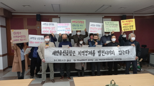 새만금 신공항 백지화 공동행동·전북민중행동은 23일, 민주노총전북본부에서 기자회견을 갖고, "국제공항 건설이 경제성장활성화에 기여한다는 주장은 근거 없이 부풀려진 무책임한 환상에 기대고 있을 뿐 현실과 다르다"고 주장했다.