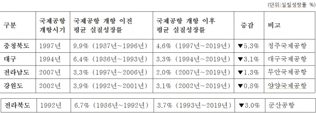 실제로 국내 지역국제공항 개항 전후로 해당 지자체의 지역내총생산 실질성장률을 비교해본 결과, 개항 이후 지역내총생산 실질성장률은 증가하기는 커녕 충청북도 5.3%, 대구 3.1%, 전라남도 1.3%, 강원도 0.8%로 각각 감소하는 경향을 보였다고 주장했다.