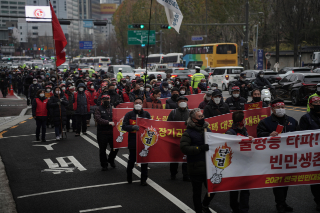 노점상과 철거민 단체가 주축이 된 2021 전국빈민대회가 2일 오후 서울시청 앞에서 열렸다. 참가자들은 노점상 생계보호 특별법 제정과 강제 철거·강제 퇴거 금지, 주거권 보장 등을 요구하며 시청 일대를 행진했다. 이들은 또 노량진수산시장 문제 해결, 장애인 탈시설 지원, 부양의무제 완전 폐지, 장기임대주택 확대 등에 대해서도 목소리를 높였다.