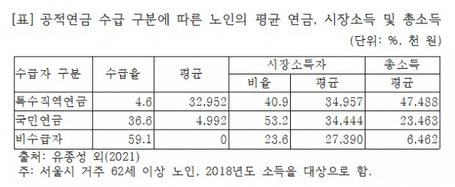 국민연금 수급자의 53.2%와 특수직역연금 수급자의 40.9%가 평균 3,400만 원 이상의 시장소득 올리고 있었다. 그러나 국민연금도 특수직역연금도 못받는 이들 가운데서는 23.6%만이 평균 2,739만 원의 시장소득을 올렸다. 즉, 이들 중 76.4%, 또는 전체 노인의 45.2%(59.1% x 76.4%)는 시장소득이 0이어서 기초연금이나 기초생활보장 급여에만 의존해야 하는 형편이다. 시장소득과 공적연금(기초연금 제외) 수령액을 합한 총소득의 평균은 특수직역연금 수급자는 4,749만 원, 국민연금 수급자는 2,346만 원, 비수급자는 646만 원(월 53만8000원)으로 세 계급 간에 격차가 뚜렷하게 나타난다(유종성 외, 2021). 결국 공적연금이 노인의 시장소득 불평등을 완화하기는커녕 강화하는 역할을 하고 있다. 그런가 하면, 국민연금과 특수직역연금은 장기적으로 재정적 지속가능성에 심각한 문제가 있고, 후세대에 막대한 부담을 안기게 될 위험을 안고 있다.