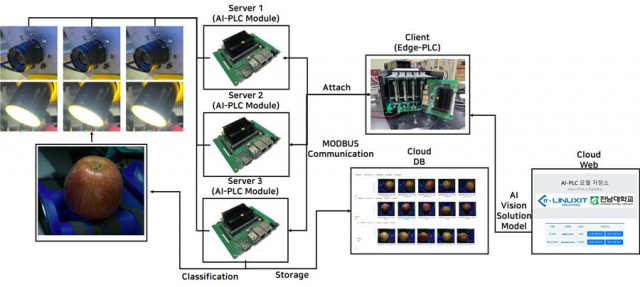 전남대 지능전자연구실(지도교수 김진영)과 초지능 미디어 네트워크 플랫폼 연구실(지도교수 김진술)은 지역 토종 기업인 ㈜리눅스아이티(대표 권경주)와 함께 인공지능(AI)에 기반한 ‘과일 선별장치 비전시스템’(PLC)을 개발했다.