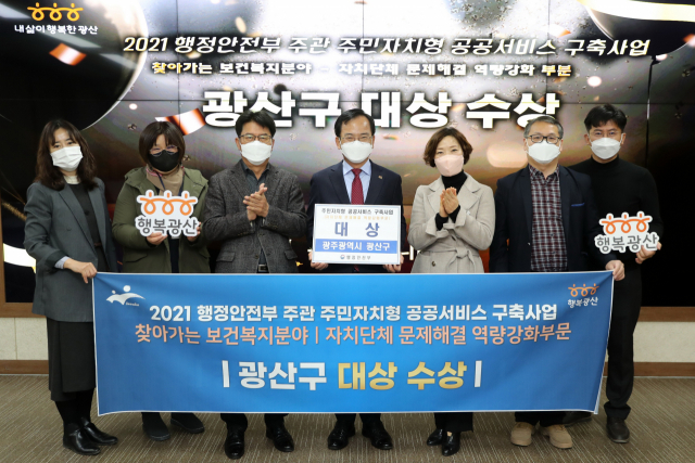 광주 광산구(구청장)가 행정안전부의 2021년 주민자치형 공공서비스 구축사업 찾아가는 보건복지분야 우수사례 경진대회에서 자치단체 문제해결 역량강화부문 대상에 선정돼 행정안전부 장관 기관 표창을 받는 쾌거를 올렸다.