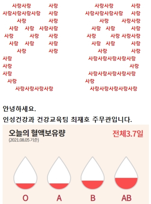 그가 직원들에게 보내는 메시지에는 헌혈 보유량에서부터 헌혈의 장점, 헌혈시 받은 수 있는 혜택 등 다양한 정보를 담고 있다. 최 주무관은 헌혈에 대한 정확한 정보를 직원들에게 전달하기 위해 직접 자료를 찾아보며 공부도 했다.