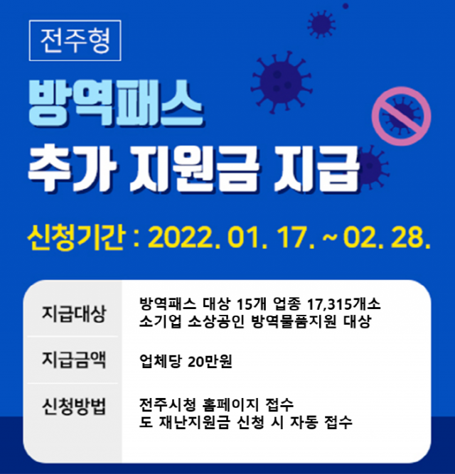2022년 전주형 방역지원금은 △QR체크기 △손소독제 △마스크 등을 구입할 수 있도록 지급되며 별도의 신청 없이 전라북도 방역지원금(80만 원)을 신청할 경우 자동으로 지급된다.