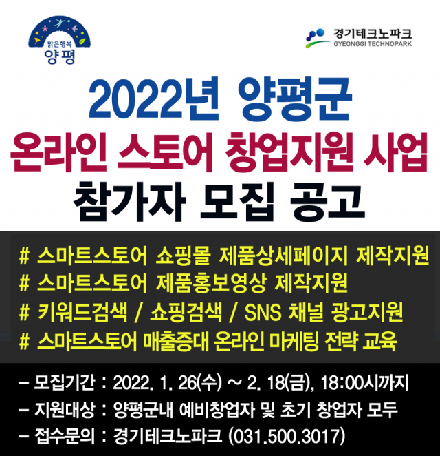 경기 양평군이 관내 중·소상공인 기업 중 성장잠재력이 높은 20개 기업을 선발해 온라인 마케팅 교육 및 맞춤형 컨설팅 등 온라인 스토어 창업을 위한 지원사업을 추진한다고 3일 밝혔다.