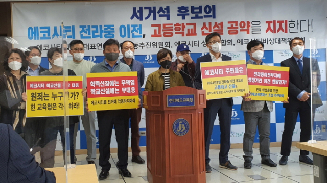 전주 송천동 에코시티 지역발전을 위한 비상대책위와 입주자대표(각 블럭 대표) 연합회 등 3개단체는 11일 전북교육청에서 기자회견을 열고 "서거석 예비후보는 일관되게 전라중의 에코시티 이전을 확약했고 예정대로 2024년 3월 개교를 약속했다"면서 이같이 밝혔다.