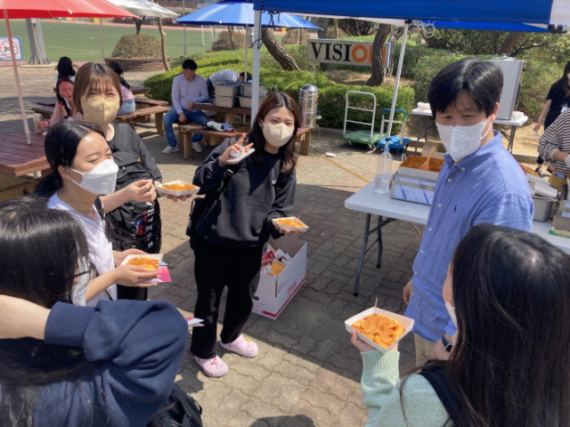 따스한 봄날 바람에 흩날리는 벚꽃 잎들이 비처럼 내리는 비전캠퍼스에서 봄의 절정을 만끽하며 떡볶이를 나누는 학생들의 모습에서 간만의 편안함과 자유로움이 배어났다.