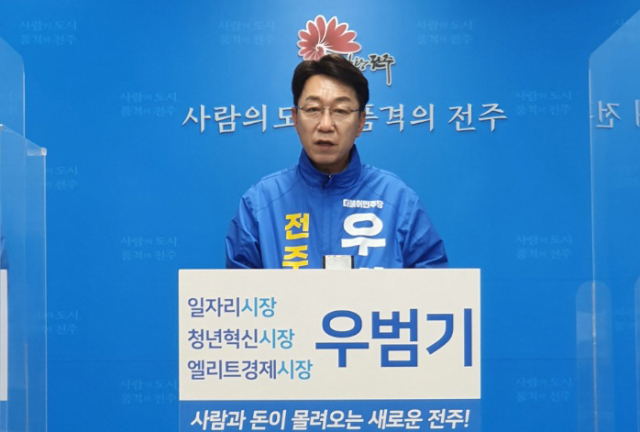 우 후보는 19일 전주시청에서 기자회견을 열고 "시대가 원하는 전주 시장은 폭넓은 중앙 네크워크와 행정력, 예산확보 역량을 갖춘 정치인"이라고 강조하며 정치교체의 필요성을 역설했다.