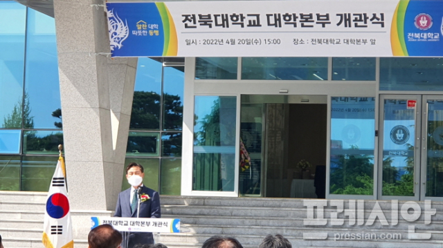 전북대학교 대학본부가 1년 8개월 여의 증축 리모델링 공사를 마치고 20일 대학본부 앞에서 개관식을 가졌다.