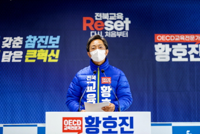 전북교육감 예비후보인 황호진 전 전북 부교육감은 21일 전북교육청 브리핑룸에서 열린 기자회견에서 "민주·시민·역사 교육을 교육과정에 담아내겠다"고 약속했다.