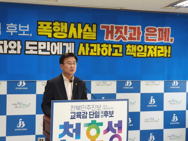 천호성 예비후보는 27일 전북교육청에서 기자회견을 갖고 상대 후보인 "서거석 교육감 예비후보가 본인이 전북대 총장으로 재직하던 시절인 2013년에 동료교수를 폭행했던 사실은 명백하다"면서 "피해자와 도민에게 즉시 사과하고 책임질 것"을 촉구했다.