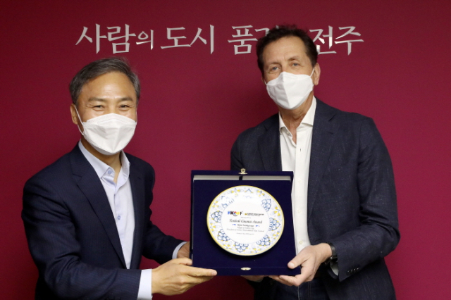 전주시는 2일 '리카르도 젤리' 피렌체 한국영화제 조직위원장이 이날 전주시청을 방문해 김승수 전주시장에게 공로패를 전달했다고 밝혔다.