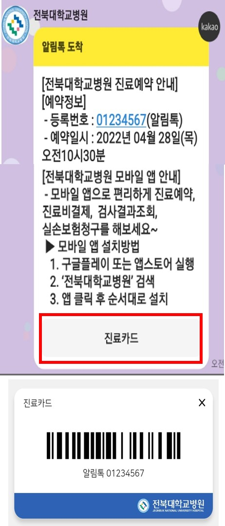 전북대학교병원(병원장 유희철)이 병원이용 안내사항을 전달하는 '카카오알림톡'에 진료카드 기능을 적용시켜 이달부터 시행에 들어갔다.