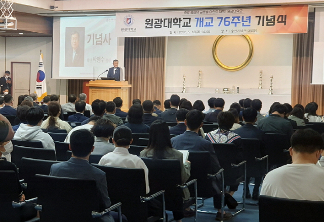 원광대학교(총장 박맹수)가 개교 76주년 기념식을 맞아 원광학원 성시종 이사장과 박맹수 총장을 비롯해 교직원, 학생 등 200여 명이 참석한 가운데 13일 교내 숭산기념관 3층 대법당에서 개최했다.