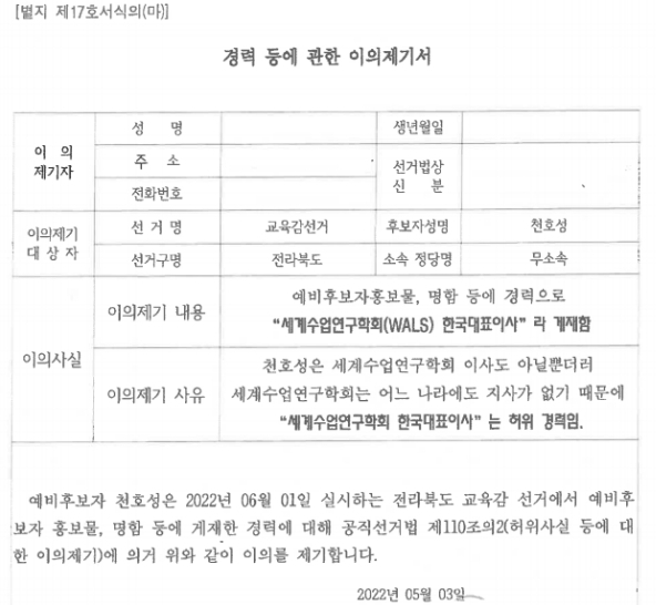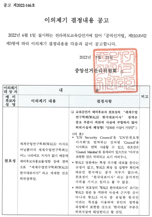 이와 관련해 중앙선거관리위원회는 ‘천 후보의 세계수업연구학회(WALS) 한국대표이사 경력은 중요 부분이 객관적 사실에 부합하지 않아 허위사실에 해당한다’는 결정 내용을 지난 15일자로 홈페이지에 공고했다.