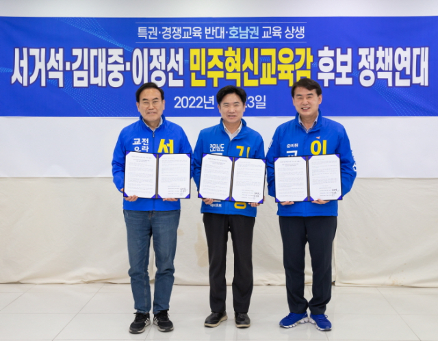 광주광역시교육감 이정선 후보, 전라남도교육감 김대중 후보, 전라북도교육감 서거석 후보 등 3명의 후보는 23일 정책연대를 위한 협약을 맺고 "윤석열 정부의 특권교육, 경쟁교육 반대와 자사고 폐지와 정시확대 반대, 교육자치 강화를 위해 함께 연대할 것"이라고 밝혔다.