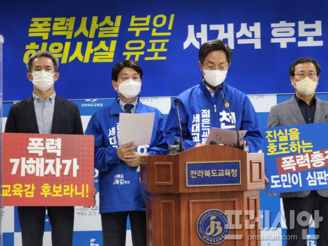 천호성 전북교육감 후보 선거대책위원회 상임선대위원장 일동은 23일 "서거석 후보가 흑색선전으로 폭력행위의 진실을 덮으려 한다"면서 검찰의 신속한 수사를 촉구했다.