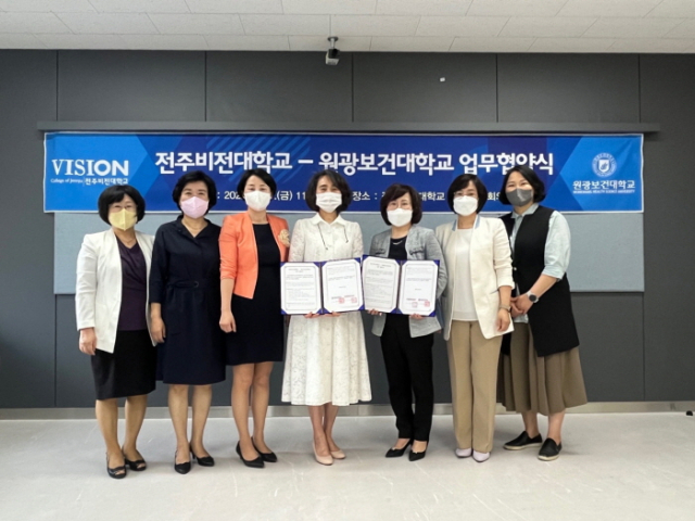 이날 협약식에는 전주비전대 김재현 학부장, 유승희 학과장, 오미숙 교수, 박승미 교수가 참석하고 원광보건대에서는 박금숙 학부장, 전은영 교수, 이명인 교수가 참석했다.